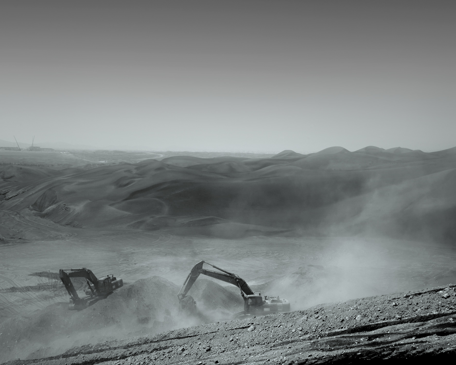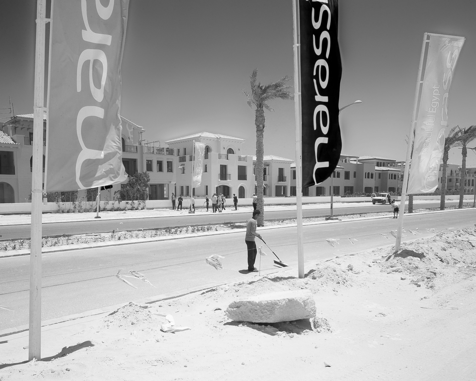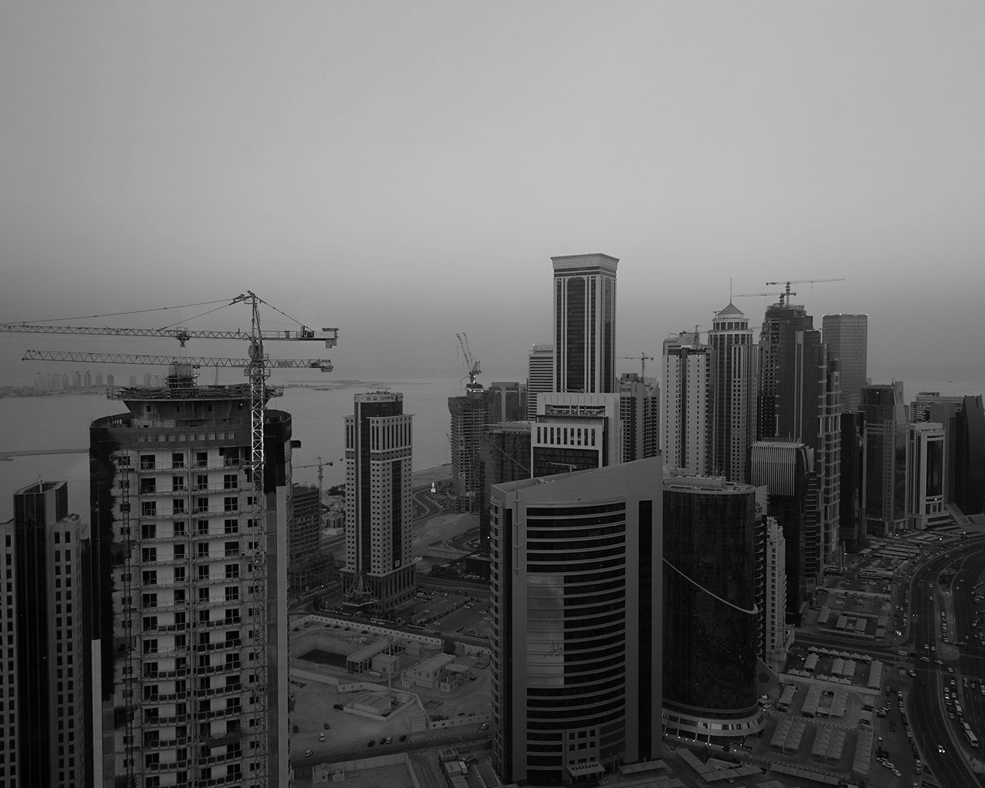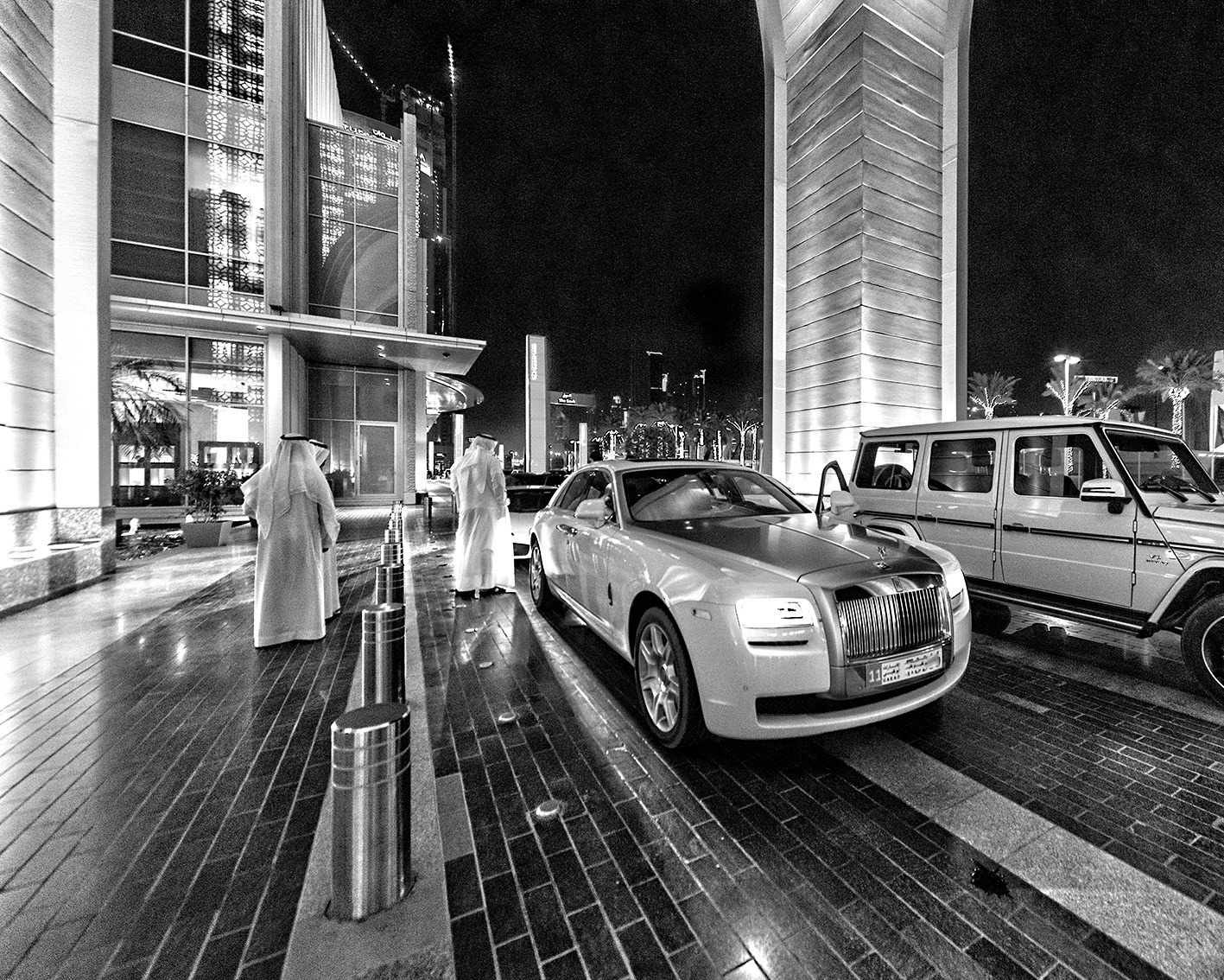 The photographs progress from vast resource hungry construction projects, workers exposed in the hard light and blank surroundings, through extravagant architecture, to opulent cities and the people who maintain and occupy them.